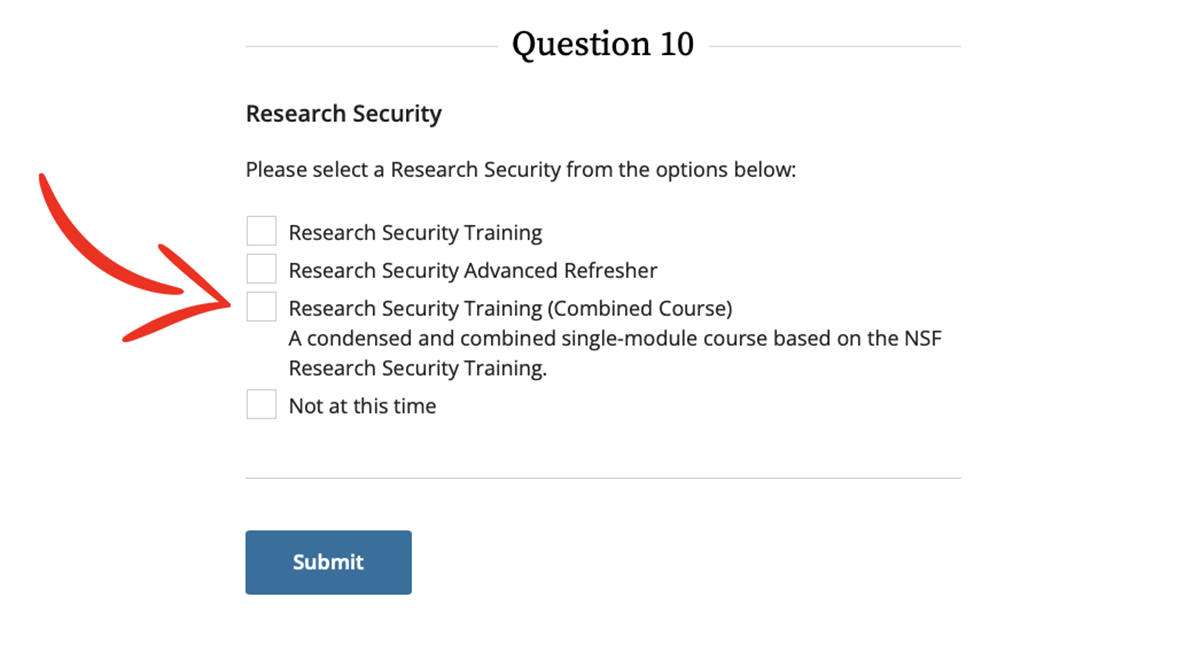 • For Research Security, select “Research Security Training (Combined Course)” under Question 10. What this looks like.
