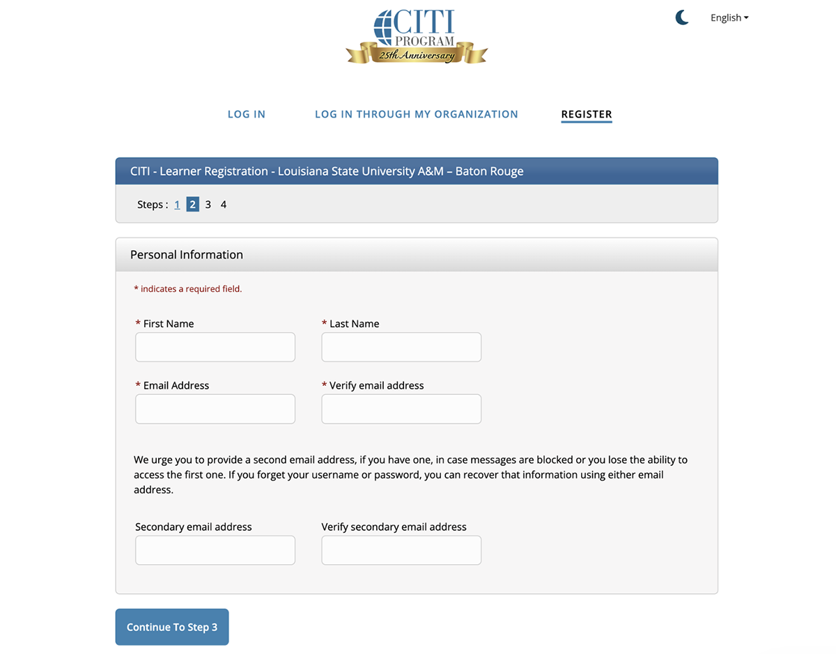 Step 4: Enter your first and last name and LSU email address. Provide a secondary email for potential account recovery. Your primary email must be your official LSU email address for the training you complete to be recognized in GeauxGrants. What this looks like.