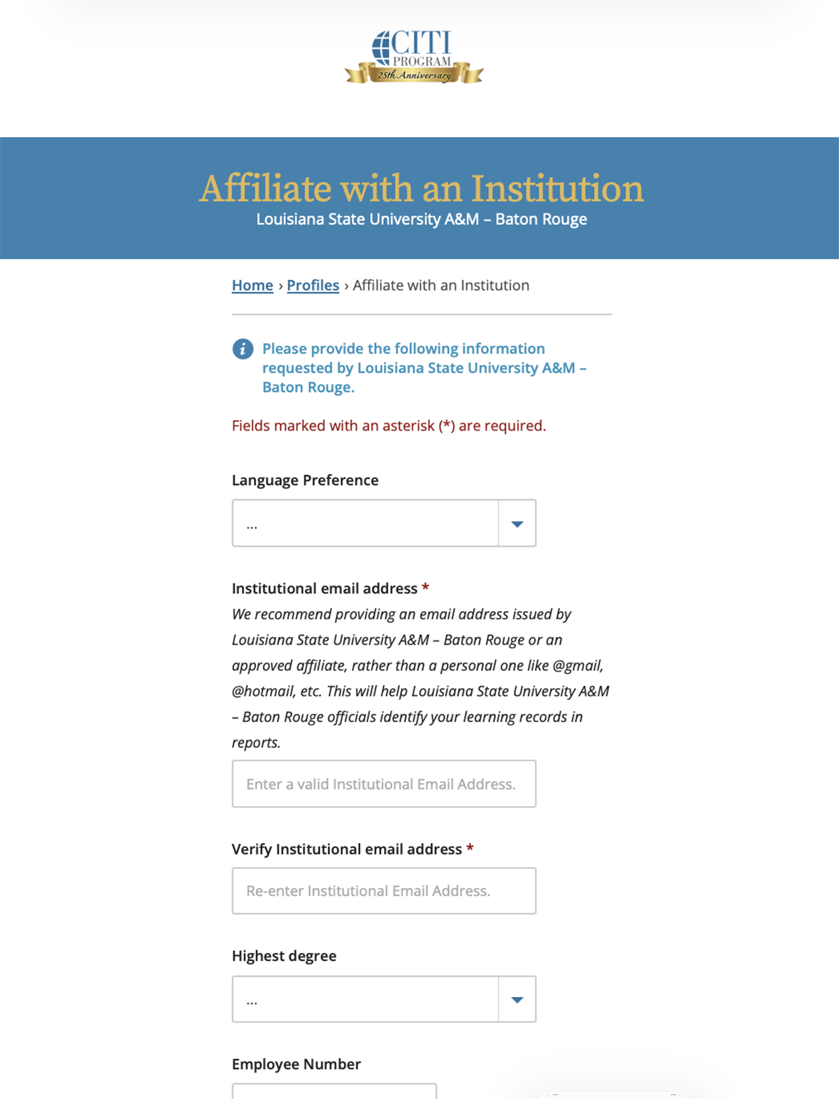 Once you affiliate with LSU, all courses required by LSU and federal agencies will be free. Please note: You must use your official LSU email address when you register with CITI for your course completions to appear in GeauxGrants.